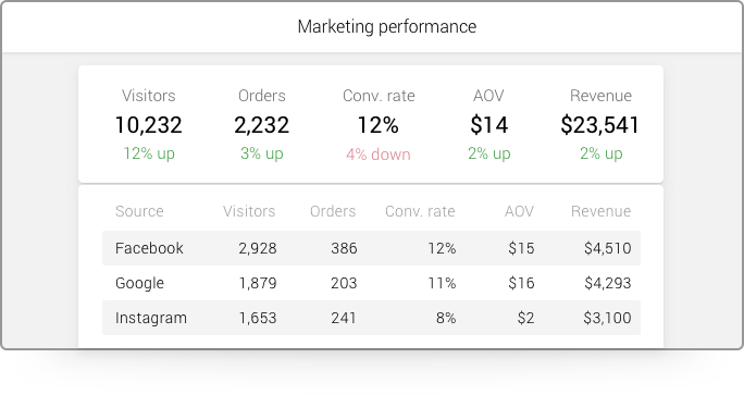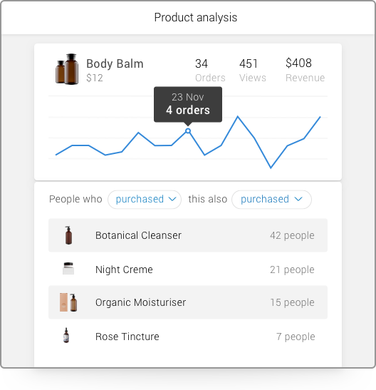 We know your products are at the heart of your business. To help you make the best decisions about new products, variants and bundles, Metrilo shows you how your products perform in terms of: