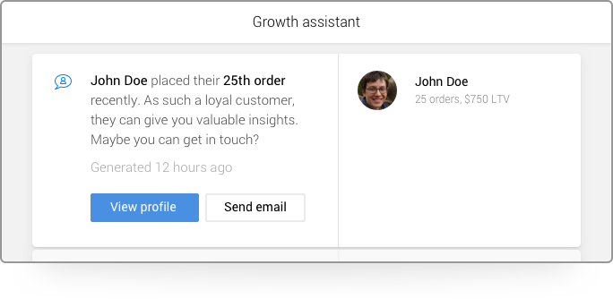 The Assistant is an active algorithm that enhances the reporting functionality of Metrilo and Metrilo is not just data reporting, the Assistant tool analyzes the data and serves you ready insights and findings, plus ways to use them to improve sales. Unhappy customers you need to get back to or a very loyal customer who placed yet another order and deserves a special reward - the Assistant will let you know.