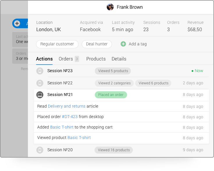 With Metrilo's CRM tool, you can use the actions that people take on your site to create segments for marketing. With over 30 filters and filter combinations that work right out of the box, sales opportunities are at your fingertips. For example, you can easily segment your most loyal returning customers who have not bought in the last month, and build a compelling sales offer just for them.