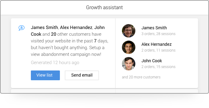 With Metrilo's email automation tools, the right message will always reach the right people at the right time. You can set up automated emails to be sent at over 20 different customer actions and trigger events for maximum personalization and relevancy. Send welcome emails on registering and thank you notes after first order, win back idle customers, cross-sell and upsell with meaningful offers, and recover abandoned carts – all 24/7, all making you money while you deal with other tasks.