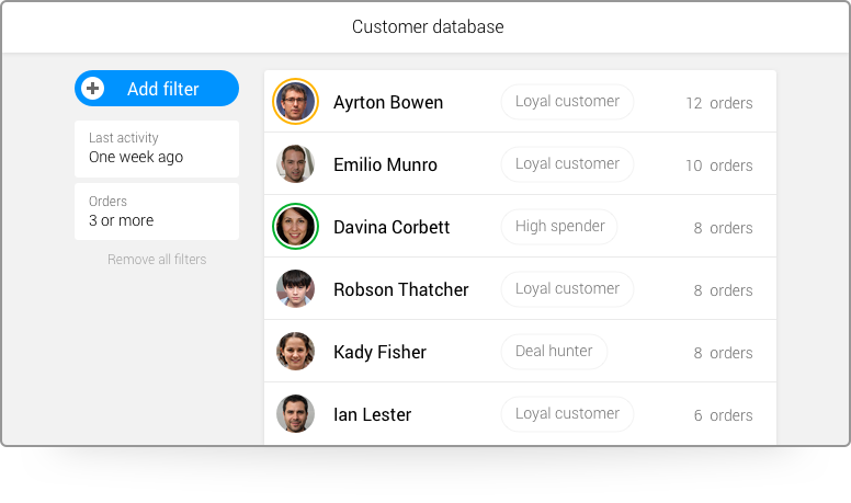 30+ filters in Metrilo help you segment, slice and analyze your customer base by behavior and characteristics. Filters are ready to work, no preset needed. Then, you can outreach to the different segments you’ve created with tailored email campaigns and offers right from Metrilo without exporting email list to other tools.