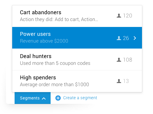 With Metrilo, you can use the actions that people take on your site to create segments for marketing. For example, you can easily segment your most loyal returning customers who have not bought in the last month, and build a compelling sales offer just for them.