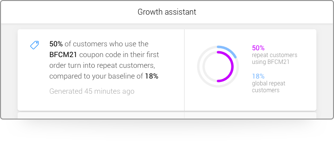 Retention is a long-term strategy and the Assistant will keep an eye for insights along the way to make sure you don’t miss valuable opportunities. Maybe your most sold product does not have the best retention rate and this is hurting you in the long run? An acquisition channel or coupon suddenly outperforming the rest in terms of CLTV? The Assistant will notify you.