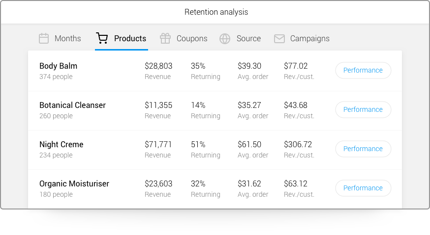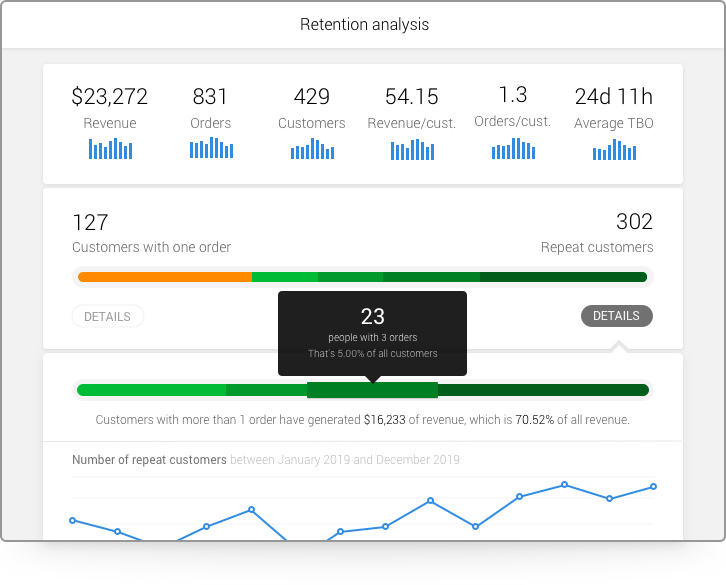 Metrilo puts customers in cohorts according to their first interactions (purchase, time, campaign, etc.) and follows how loyal over time these cohorts are. You see which products and campaigns drive customer lifetime value and which ones attract one-timers. It also shows clearly when people place subsequent orders and when they stop buying so you can time your email communication accordingly.